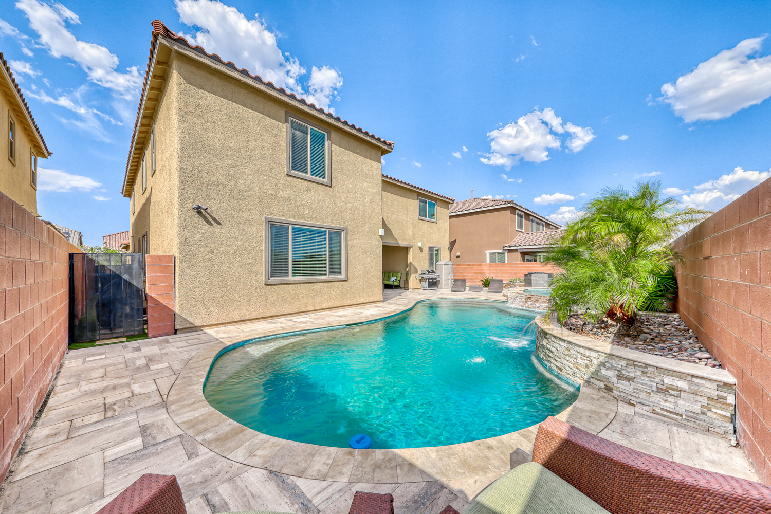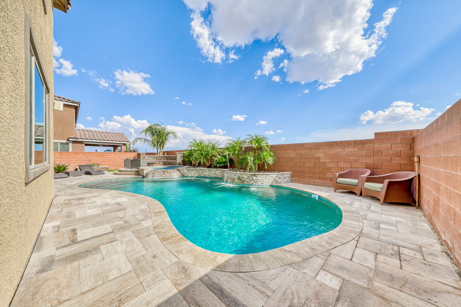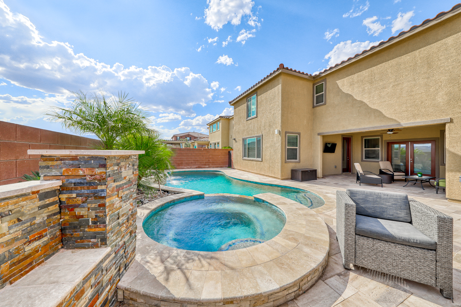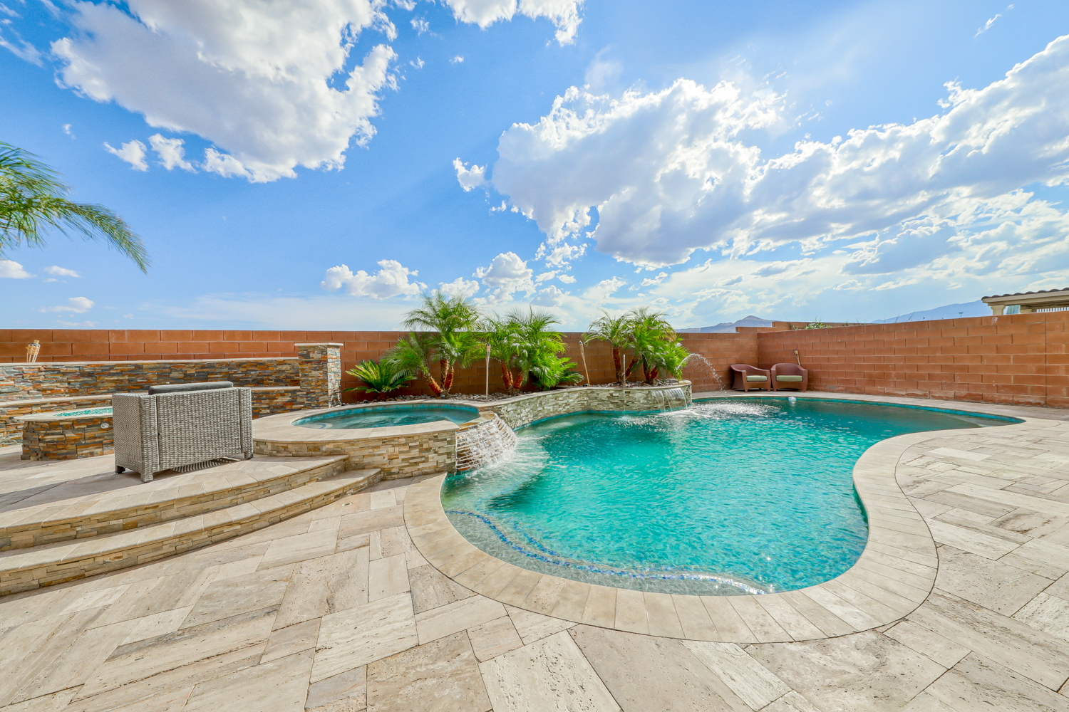Backyard with stunning Tropical Pool and Spa w/ Stacked Stone Waterfall and sheer descent. Multiple benches & color-changing LED mini lights in the pool. Also includes a connected seating area with glass fire stone in a gas fire pit, perfect for hosting events under Mountain’s Edge Desert skies.