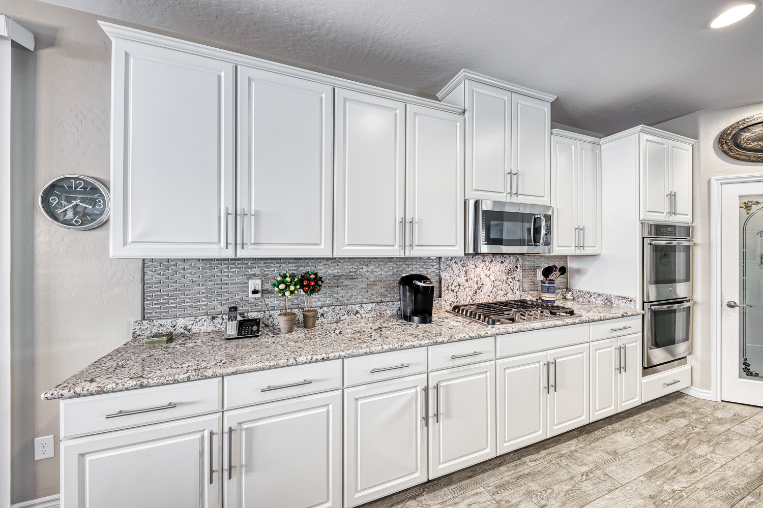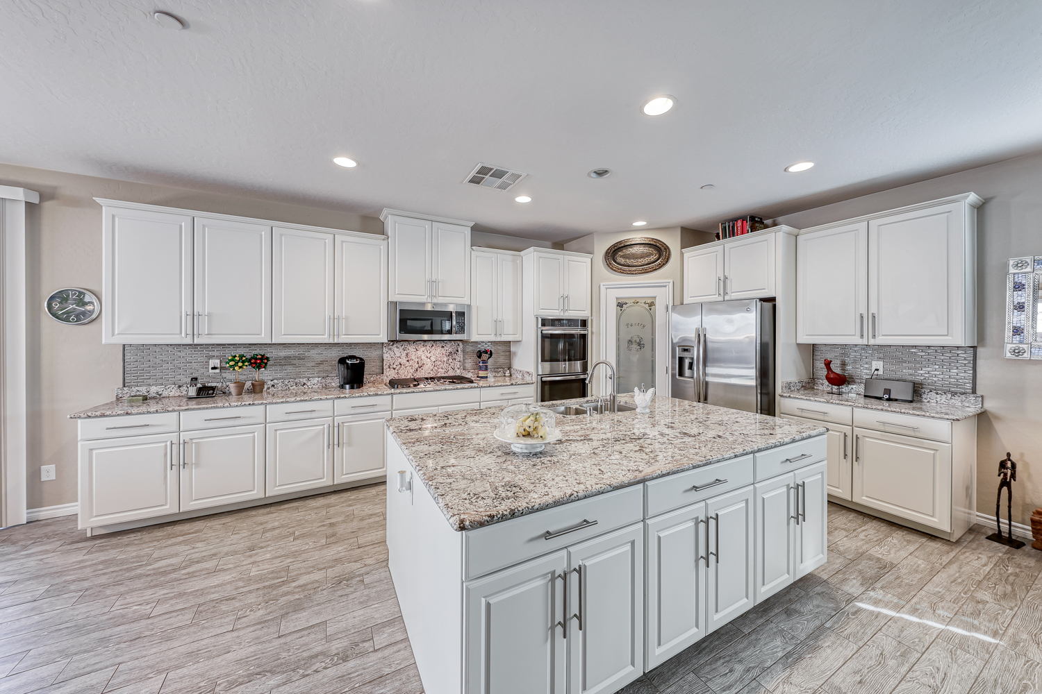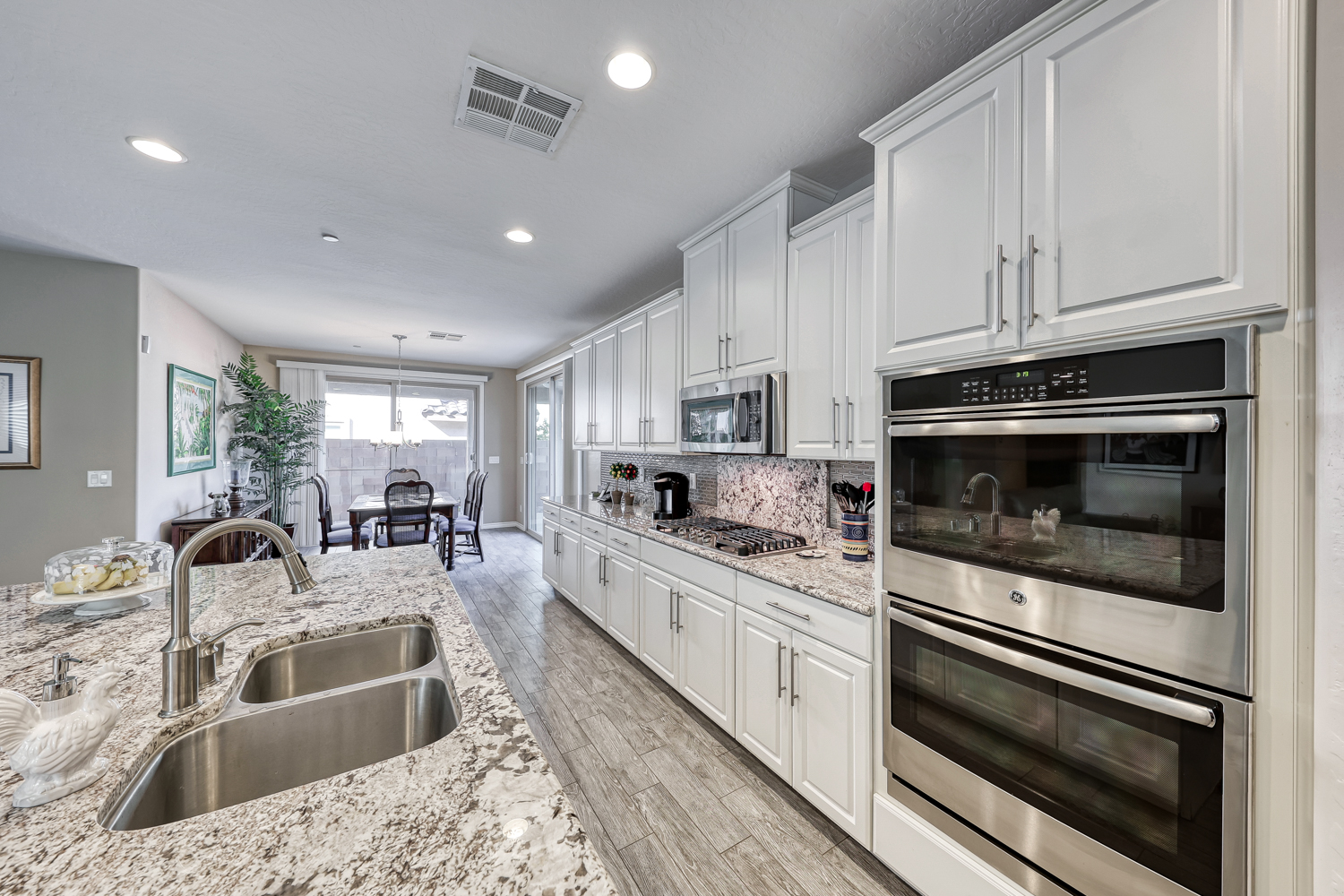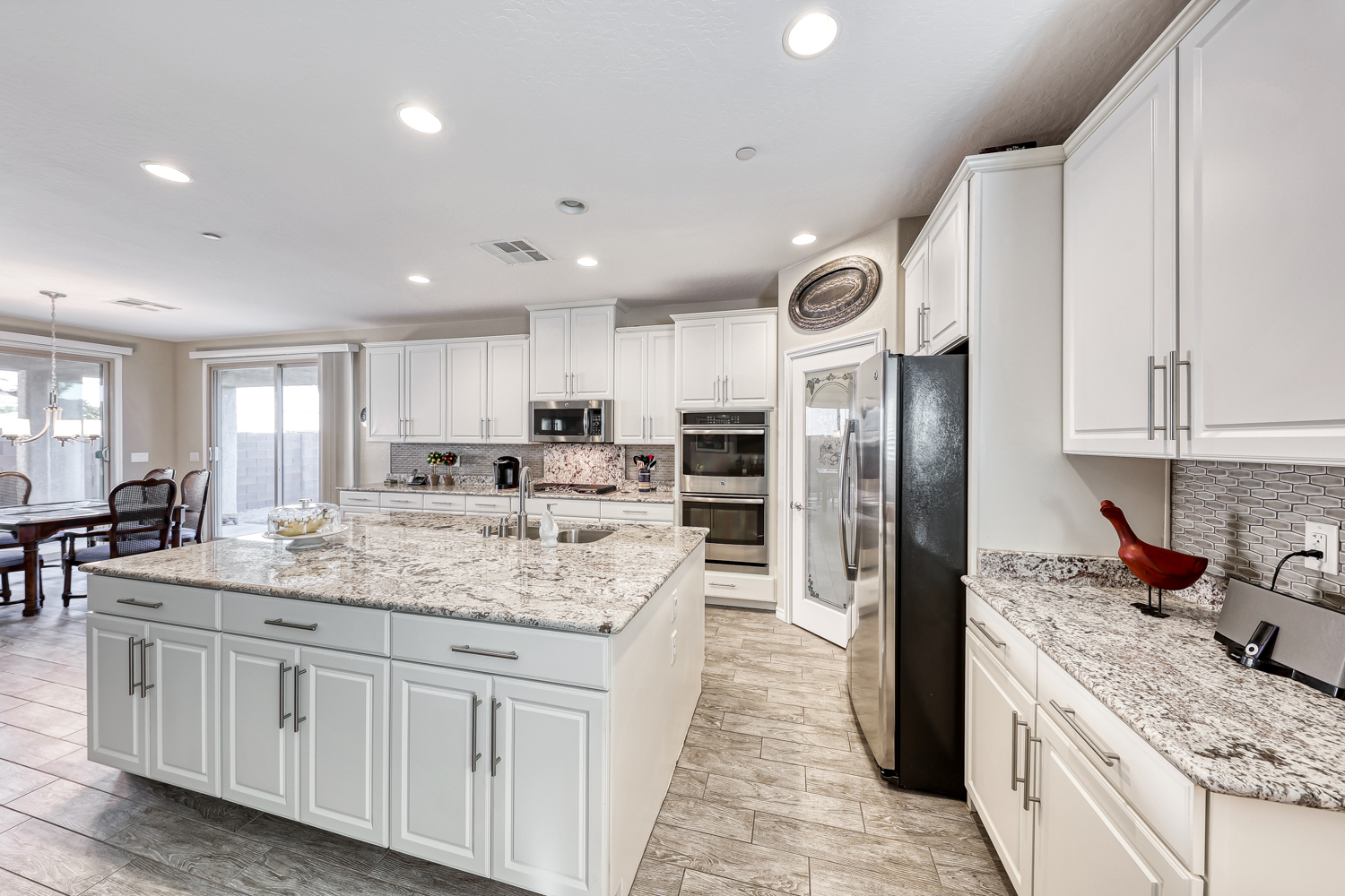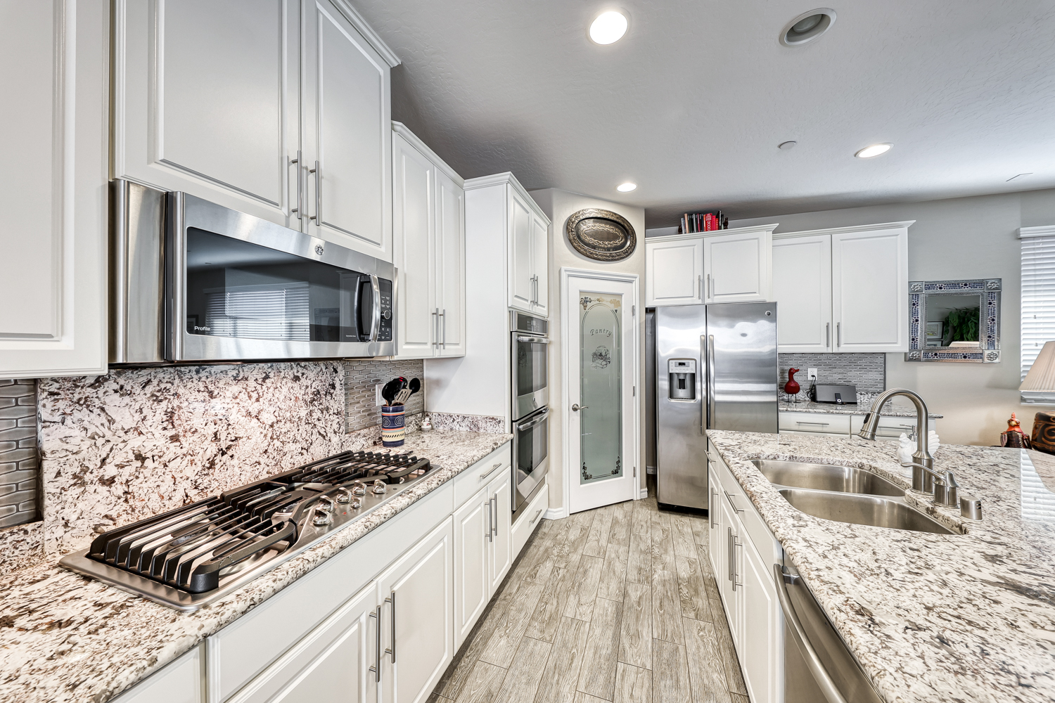 Large kitchen with huge island in a gorgeous gray and white granite, GE Stainless appliance Package with double ovens, 5 burner cooktop, designer backsplash and beautiful granite opens to spacious family room.