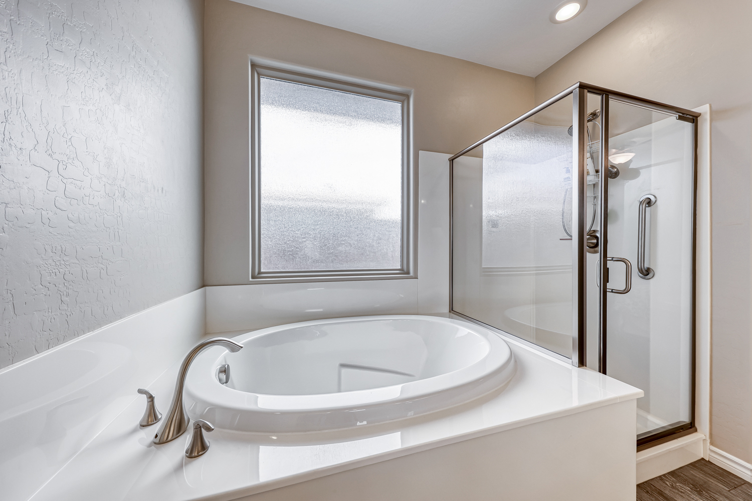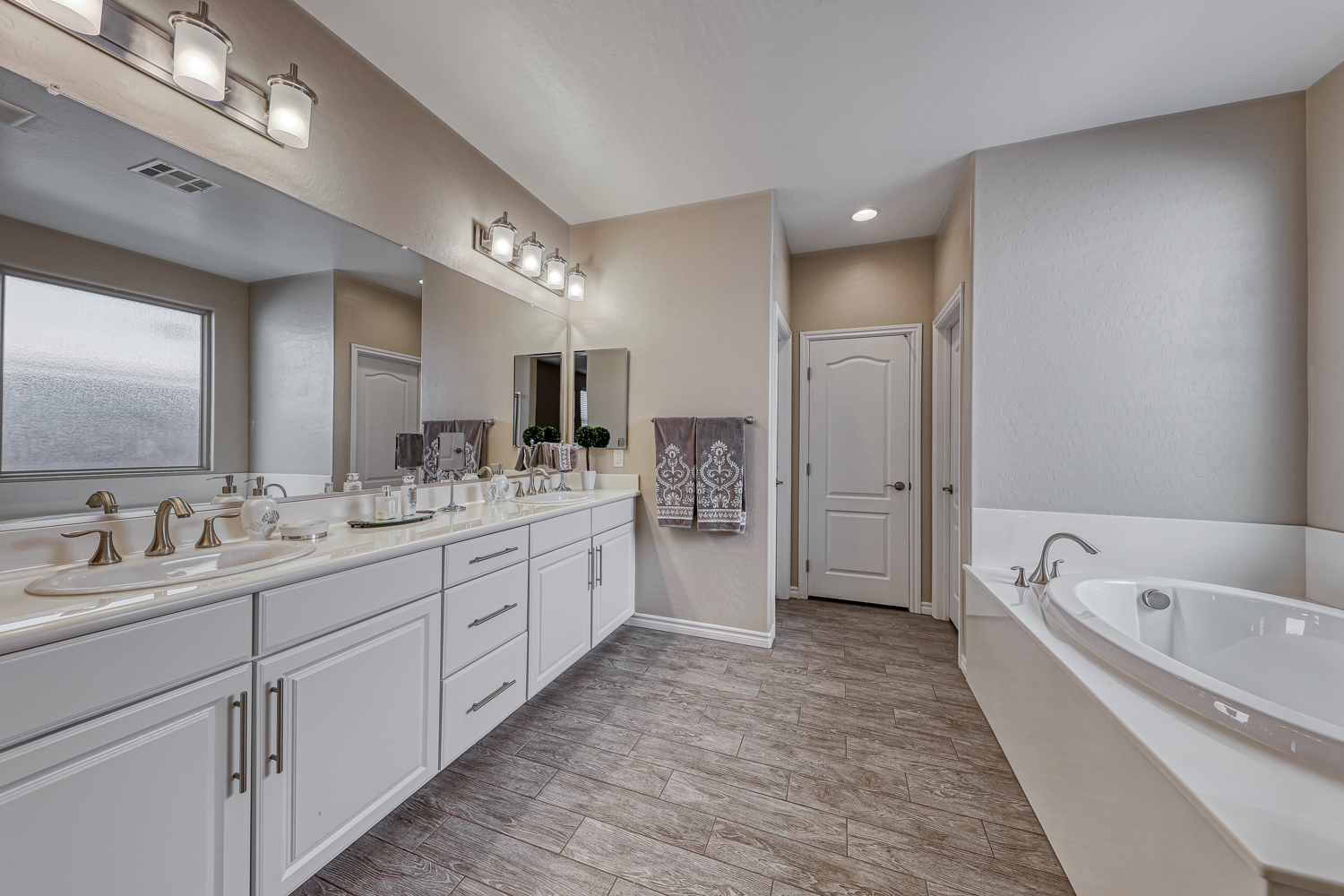 The primary bedroom has tons of space to have a sitting area, ensuite primary bathroom has European height vanities, separate soaking garden tub and shower, plus a large walk in closet.