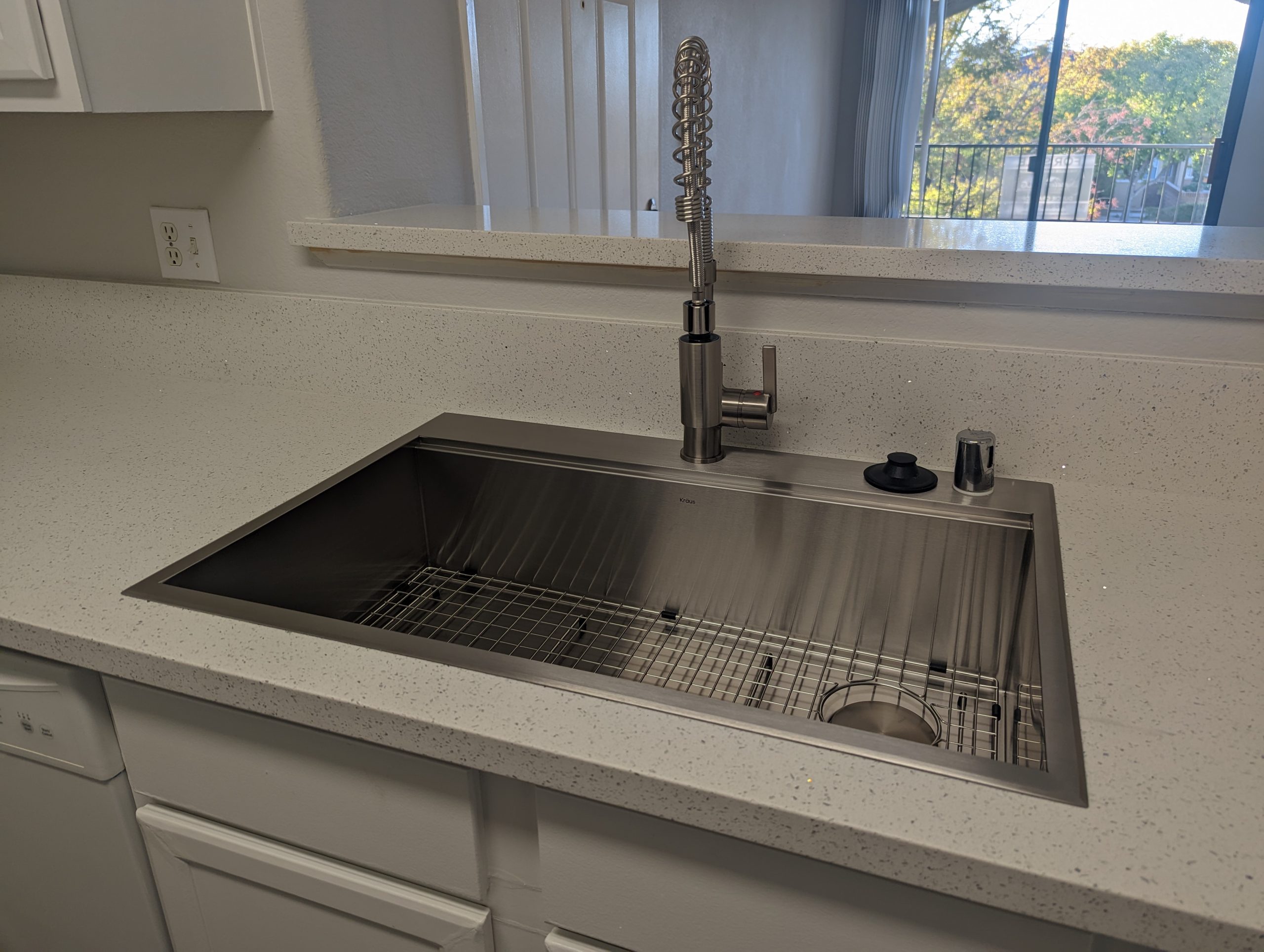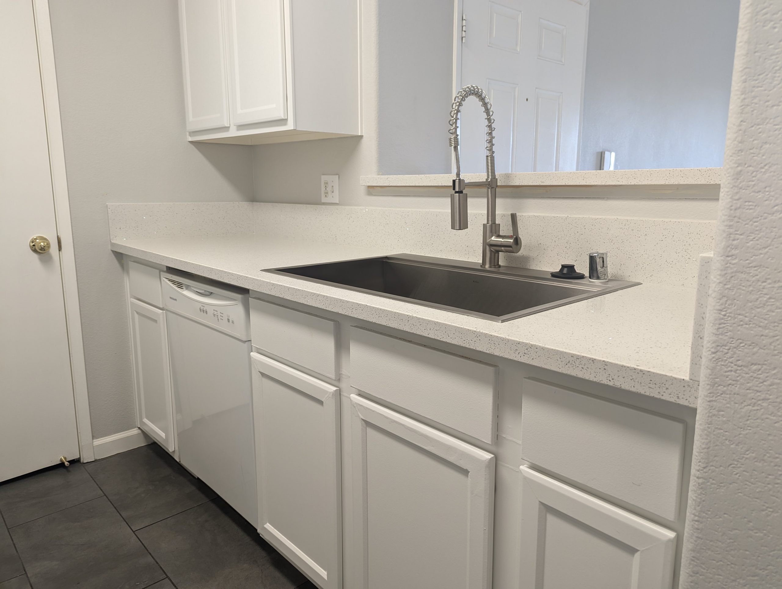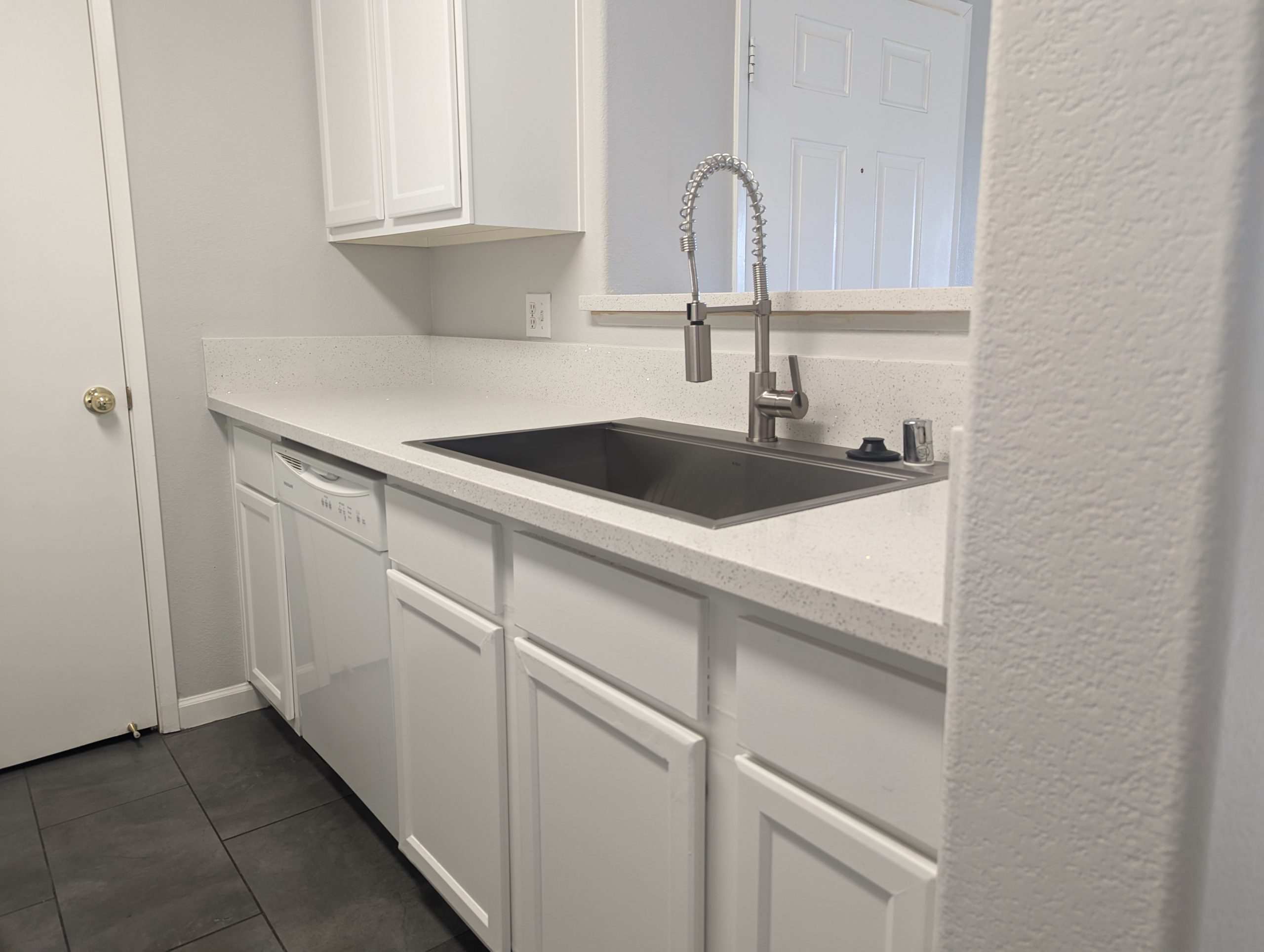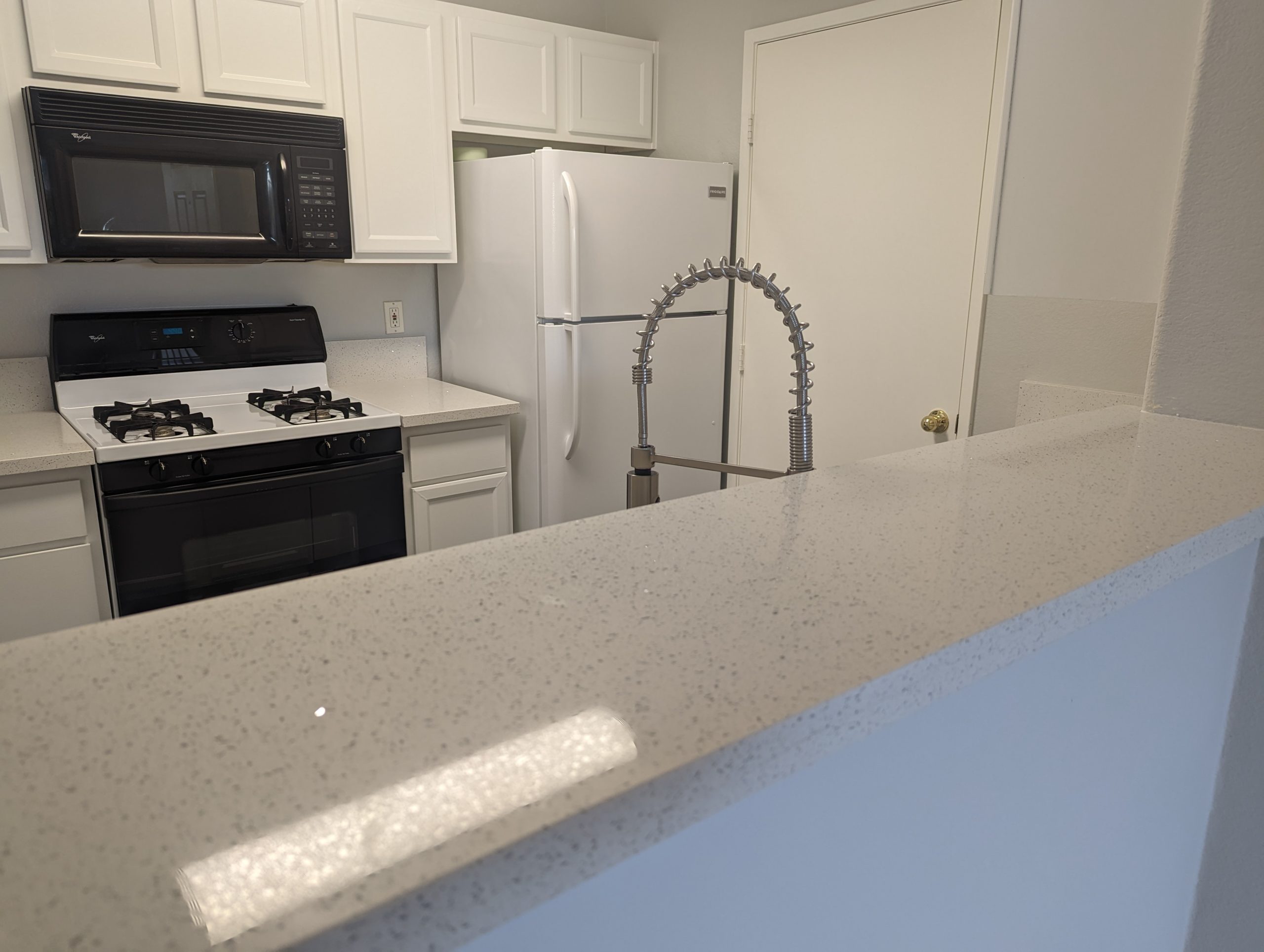 Freshly refurbished white cabinets at the breakfast bar kitchen.