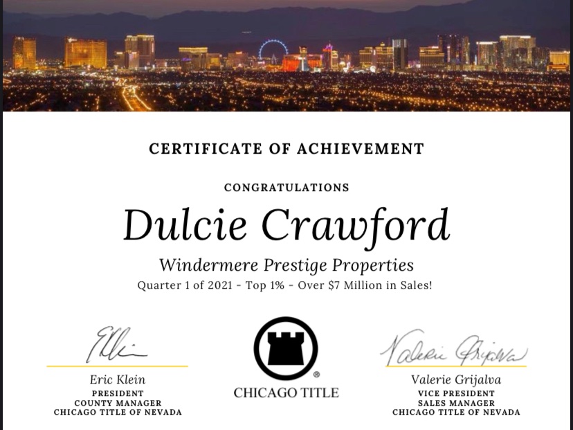 Dulcie Crawford and her team were recognized by Chicago Title for being in the top 1% for real estate sales in the Las Vegas Valley for the 1st quarter of 2021. This, after being names as the top agent for 202o at Windermere Prestige Properties.