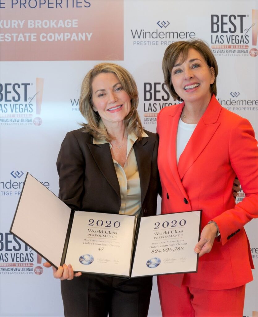 At a recent awards lunch presented by Robyn Yates, broker at Windermere Prestige Properties in Henderson, NV, Dulcie Crawford was recognized as the top agent in the office for 2020. Though Dulcie joined Windermere Prestige in the spring of 2020, she was number one for sales volume at $24,826,783 and 47 properties sold and is on track for even higher numbers for 2021.