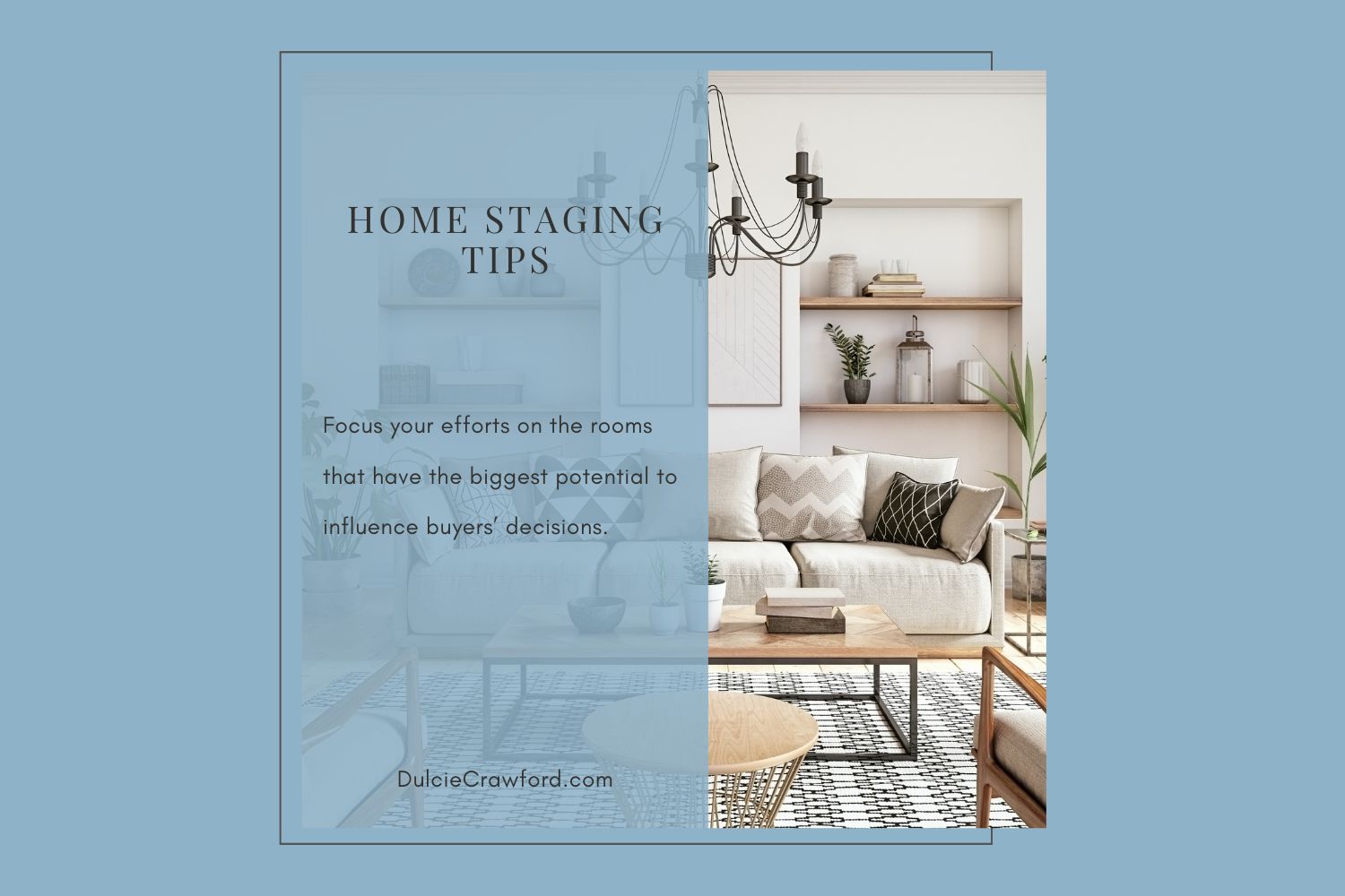 Essential Rooms to Stage and Yard Space: The living room, kitchen, and master bedroom are often considered the most important rooms to stage, having the greatest impact on potential buyers. Curb appeal and Outdoor yard space are also essential to increase property value.